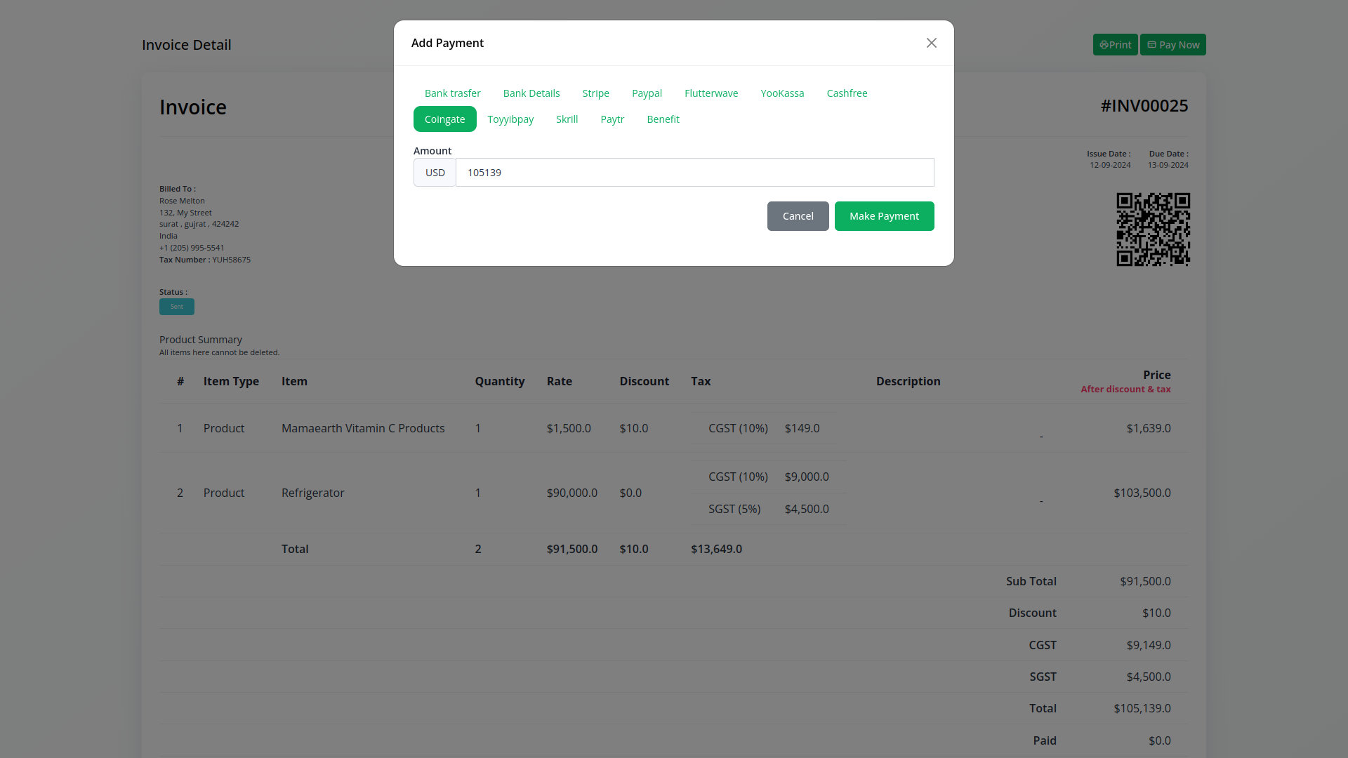 Streamline your payment process with the CoinGate Payment Gateway, featuring efficient electronic invoicing (retainer and sales), plan payments, and secure payment initiation and authorization. Seamlessly use this gateway to handle not just invoices and plans but also to purchase multiple add-ons, enhancing your business capabilities with ease.