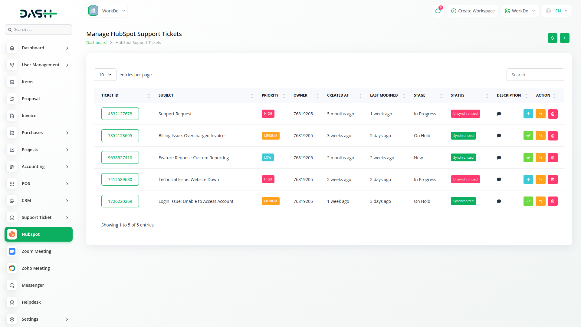 Managing support tickets across multiple platforms can be challenging, but this module eliminates the hassle by automatically syncing all customer support tickets with HubSpot. Any new ticket created in Dash SaaS is instantly reflected in HubSpot, allowing support teams to track, update, and resolve issues without switching between systems. This ensures a more efficient workflow and reduces the chances of missed or delayed responses.